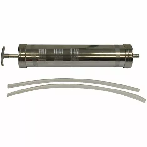 Seringue de vidange en mĂ©tal avec tuyau d’aspiration.